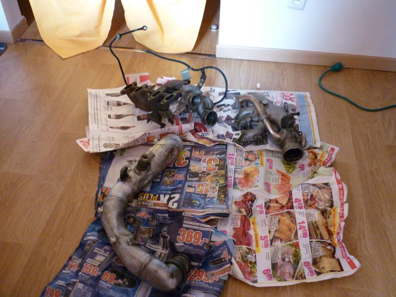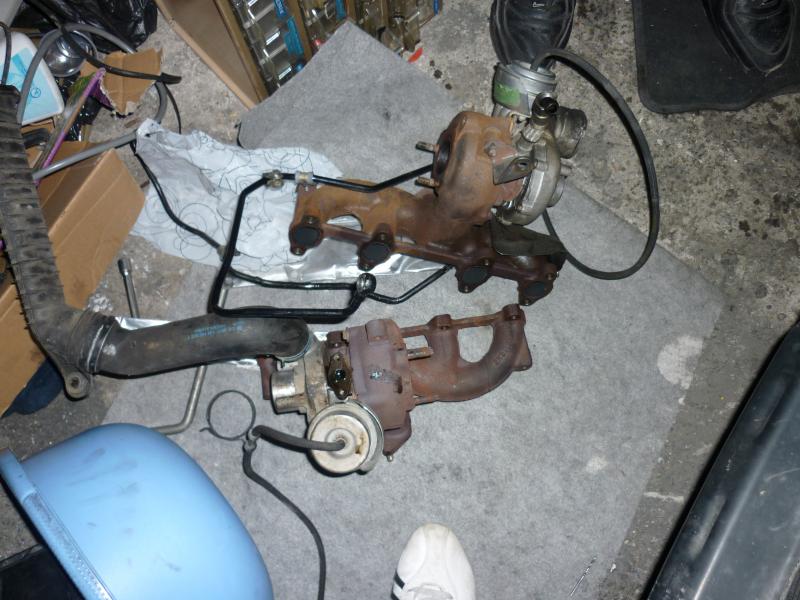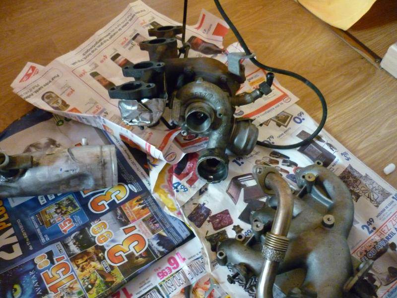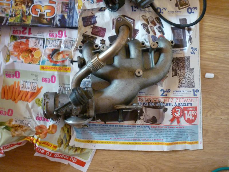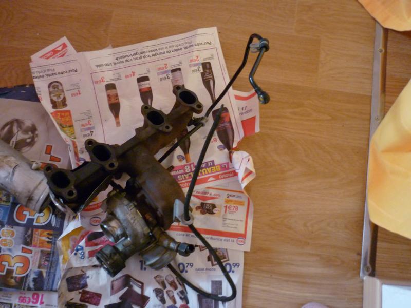 dar 0 Posté(e) le 18 janvier 2011 Bon je viens au news, après avoir passé mes partiels du semestre 7, j'ai enfin du temps libre, reception de ça : Concernant son état, il a l'air nickel, la commande de GV bouge pas très bien, mais je compte le démonter pour faire un tit nettoyage quand à faire, concernant la pipe admission et la vanne EGR, il une petite couche de calamine. Mais je suis etonné, je le croyais un peu plus gros ce turbal Me manque juste tous les joints à acheté :mrgreen: j'y vais demain, en même temps, je vous laisses les refs pour compléter mon prochain tuto.Bon weekend prochain, direction Lyon, pour le monter avec un ami. Réfs : joint collecteur d'echappement.........: 037 253 039 D (x4).......=8€01 (pochette de 4 ou unité ) joint collecteur d'admission..............: 028 129 717 D..............=7€06 plaques EGR....................................: 038 131 925 A (x2).......=2€75 (x2) joint EGR/tube recyclage..................: 069 131 547 D..............=2€99 joint turbo/recyclagE........................: 038 131 547 A..............=3€71 N75 pour ASZ.................................: 1K0 906 627 A...............=53€10 ajustage fileté avec joint cuivre.........: 028 145 786..................=28€94 (arrivée d'huile turbo) joint retour d'huile turbo...................: 028 145 757.................=2€15 (joint en losange) Partager ce message Lien à poster Partager sur d’autres sites