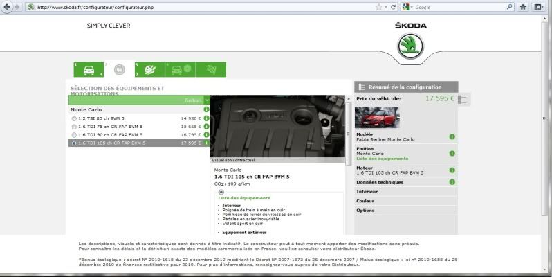 ebby 0 Posté(e) le 16 août 2011 Oui.. Malheureusement le Maxi Dot et l'Amundsen ne sont toujours pas sur la liste des options de la Monte Carlo, quoi qu'on fasse.. Du coup je vais orienter mon achat sur une Experience avec le styling kit : en noire avec le toit blanc. En fait avec la Monte Carlo et 10 options on arrive au meme prix que l'Experience + Styling kit et la Monte Carlo a moins d'équipements... On voit quelques photos ici d'une Experience avec Styling kit : http://www.forum-auto.com/marques/skoda/sujet37-6545.htm Les jantes sont celles de la vRS, mais en blanc. Ceci dit j'ai essayé une Monte Carlo hier et son look est vraiment superbe... En blanc, le kit carrosserie ressort vraiment bien, et a l'interieur le ciel de toit noir Ca fait longtemps qu'ils bossent sur la reprog du 1.6L TDI CR, pourquoi ca prend autant de temps ? Partager ce message Lien à poster Partager sur d’autres sites