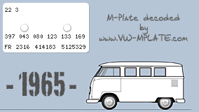 coxichou 0 Posté(e) le 17 août 2009 merci pour l'info ils m'ont trouver la couleur exterieur que je n'avais pas reussi a décoder. [img][/img] Ce qui n'a pas été décodé: 41 41 : code couleur 41 en haut et en bas = L345--->Light Grey Contenu de la M-Plate Modèle Type 2 (T1) mod. 231 - Combi, portes latérales à droite, Conduite à gauche Date de fabrication le 22 Mars 1965 Peinture Haut : Light Grey Bas: Light Grey Couleurs intérieures (panneaux de portes et sièges) 83 - Gris Pays de destination: France 043 Preparation for Swiss license requirements 080 Split front seats (walk-through) Kombi and Panel 123 Special resister ignition 169 Sliding door - Kombi 231-238 397 Prepared for France M-CODES non trouvés 133 Si quelqu'un sait me dire ce que signifie "Special resister ignition" ainsi que le code 133 !! Et la M-plate sera décodée!! Partager ce message Lien à poster Partager sur d’autres sites