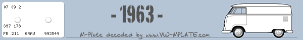 david43 0 Posté(e) le 23 octobre 2010 pour les "M-codeurs"M-Plate content:Type 2 (T1) mod. 211 :- Panel van- Cargo doors right- LHDChassis number: 993549Serial number: 21993549Modelyear: 1962 millésime 1963Planned production date: September 07 ,1962Paint color: L345 - Light GreyInterior color: (doorpanels and seats) 80 - GreyDestination FranceM-CODE 178 RPM limiter - 1200cc engine - 397 Equiped for France (yellow headlamps, right rear view mirror and rear reflectors) Partager ce message Lien à poster Partager sur d’autres sites