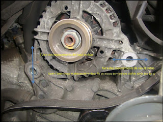 Retirer l'alternateur n'est pas si aisé ; il faut le bouger de gauche à droite et de haut en bas. Plusieurs fois. A un moment, il viendra tout seul. Derrière l'alternateur se trouve deux connexions électriques. Déconnectez les puis installez votre nouvel alternateur.