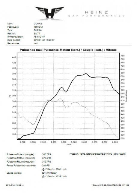 lucaralf 0 Posté(e) le 31 janvier 2010 149.3 et 335Nm de couple pour ma Toledo (105 et 255Nm)La GT-R ba pas eu de résultat claire, car la première fois l'esp a tout faussé, après elle patinait sur le banc après t° boite trop haute (98° en réelle) et t° embrayage trop haut, je pense que trop d'électronique a pour effet de vraiment mettre en vrac ce genre d'exercice, en fait les capteurs ne devaient pas avoir des infos cohérentes car l'air aspiré ne devait pas correspondre à la vitesse enregistré !!!Au bilan on a le couple Max 698/711 Nm environ la puissance il manque 1000trs pour l'avoir et on a juste eu 553Cv(on suppose qu'il manque au moins 10/15cv)voilànormalement elle repasse dans la semaine pour essayer de nouveau En tous cas merci à tous, même si j'ai pas eu l'okaz de discuter avec tout le monde, mais une petite bande bien sympa, des Supra magnifiques, qui glissent bien de l'arrière (surtout la grise avec la nana qui encaissé la monnaie lorsque nous faisions des photos )Une Sierra au coffre inviolable, d'ailleurs même sur le banc impossible de la violer Merci Partager ce message Lien à poster Partager sur d’autres sites